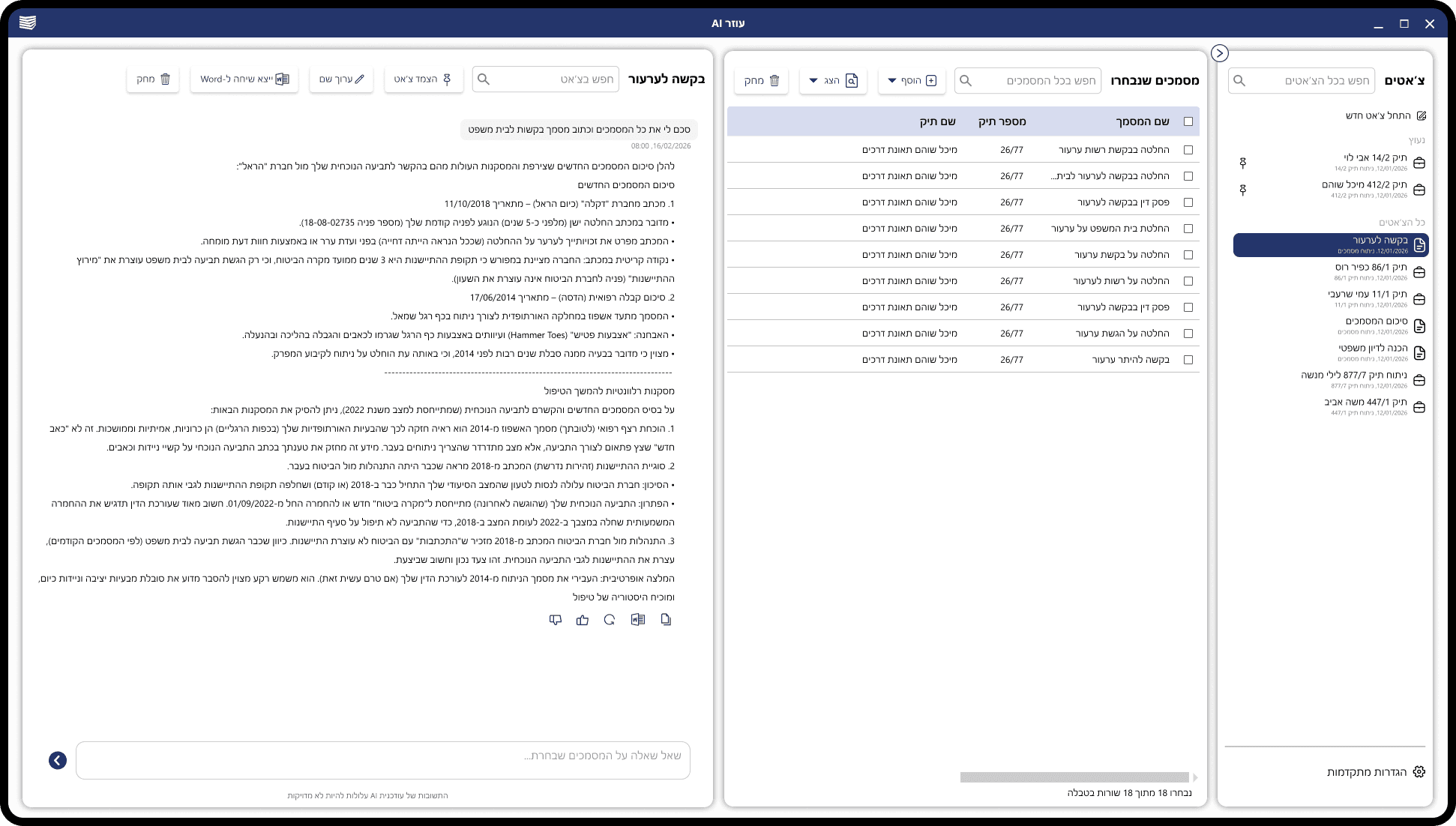 Users can upload documents and let the assistant summarize key points, prepare for hearings and meetings, or generate new legal drafts based on their specific case files.