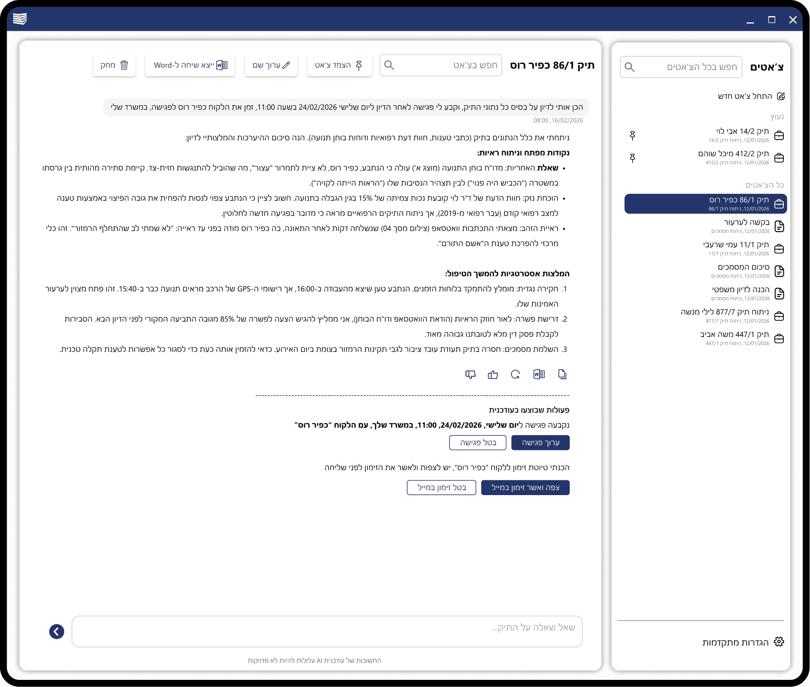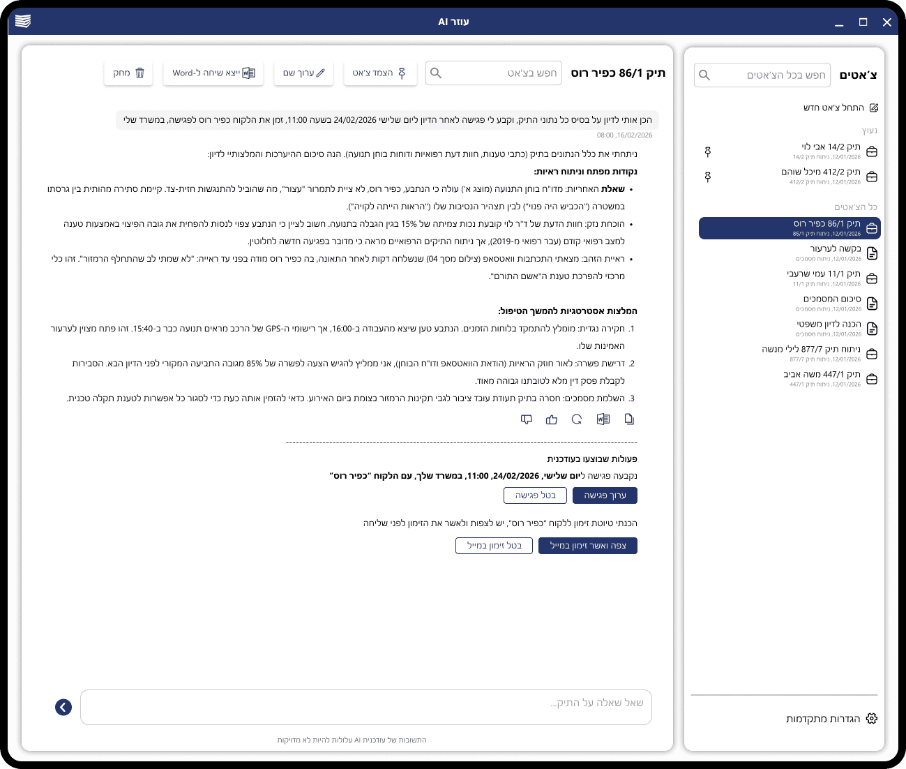 The goal of this project was to simplify this mess. We built an AI Chat that lives inside the system. Instead of digging through files, users can just ask the chat questions about their case. But we didn't stop at just talking; we made the chat functional so users can create meetings and tasks directly from the conversation.